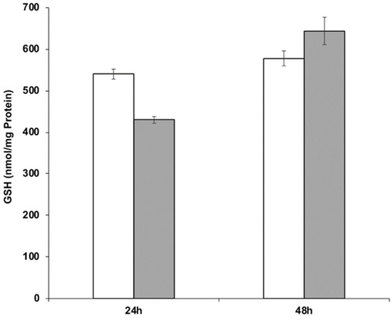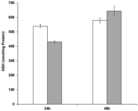 GSH production during the batch cultivation of the Y. lipolytica strain RIY389 (pTEF-ylGSH1-ylGSH2-INU1) in INU medium (white bars) and INUC medium (grey bars). The glutathione titer value was expressed in nmol per mg of protein (nmol/mg Protein). Data are the mean and standard deviation of two experiments.