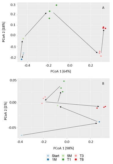 Principal coordinate analysis (PCoA) based on Bray–Curtis distances showing the microbial community shift during the enrichment. (A) Bacterial community (16S rRNA gene amplicon sequences) and (B) methanogenic community (mcrA gene amplicon sequences). The labels of the figure are as follows: inoculum (Start), one month (1 M), 5 months (5 M) after fed-batch feeding during the first stage; first transfer (T1), third transfer (T3), and sixth transfer (T6) after fed-batch feeding in the second stage.