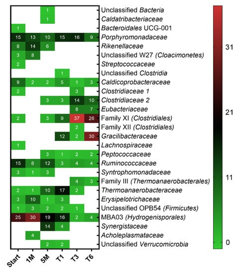 It is notable that, in T6, Lutispora was the predominant genus, with a relative abundance of 31% (Figure S7). The only described species of this genus is a thermophile not known to be a homoacetogen, which suggests that novel homoacetogenic species may be present in the enrichment culture and supports the need to further explore such unknown microbiota. This genus belongs to the clostridial family Gracilibacteraceae, which was found to be in low relative abundance in a former study [26]. Other genera such as MBA03 (Hydrogenisporales) (19%), unclassified Family XI (Clostridiales) (15%), Natronincola (10%), unclassified Rikenellaceae (11%), Fastidiosipila (8%), Garciella (7%), and Petrimonas (5%) were also abundant in the bacterial community (Figure S7).