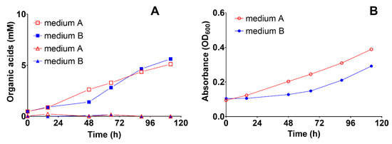 First, we assessed the effect of yeast extract in a medium containing cysteine-HCl as a reducing agent by comparing its cultivation in mineral medium with (medium A) or without yeast extract (medium B). Acetate was produced up to ~5 mM in both media, whereas formate was not produced at all (Figure 4A). However, medium A yielded 25% more biomass than medium B after the first batch-cycle feeding (p = 0.0031), even though the yeast extract concentration was as low as 0.25 mg L−1 (Figure 4B). A cultivation broth with such low concentrations of yeast extract is considered a mineral medium [63].