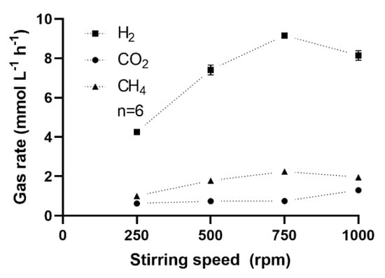 Next, the effect of the stirring intensity on the CH4 formation rate was analyzed. Improved mixing was reported to enhance the gas mass transfer and, hence, the CH4 formation rate [3,17]. As shown in Figure 6, the CH4 formation rate increased proportionally, with the stirring intensity up to a maximum of ~9 mmol L−1 h−1 at 750 rpm. However, in this particle-free enrichment culture growing in a mineral medium, increasing the stirring intensity further to ≥1000 rpm was detrimental (Figure 6) for both CH4 formation and H2 consumption rates. Although shaking exerts a different type of mixing than stirring does, our results are in line with a previous study, where shaking intensities of 200–250 rpm were already detrimental for biomethanation performed with sludge [28]. On the contrary, an in situ biomethanation study working with sludge reported improved gas mass transfer with a stirring intensity as high as 1000 rpm [69]. This indicates that sludge can better resist shear forces caused by high stirring intensity than enrichment cultures, so that selecting a proper mixing intensity is dependent on the type of liquid matrix used as the biocatalyst. Under optimal conditions, the enrichment culture was capable of consuming the gaseous substrate within 24 h or less, similar to times reported elsewhere [17,70]. It is important to note that high shear (stirring speed ≥ 1000 rpm) may have a negative effect on the syntrophic interactions between bacteria and methanogens.