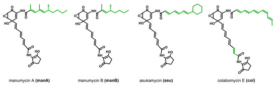Structures of manumycin-type metabolites used in the study. Variable parts of molecules are shown in green. Manumycin A and B are produced by Streptomyces parvulus Tü64, asukamycin by Streptomyces nodosus ssp. asukaensis, and colabomycin E by Streptomyces aureus SOK1/5-04.