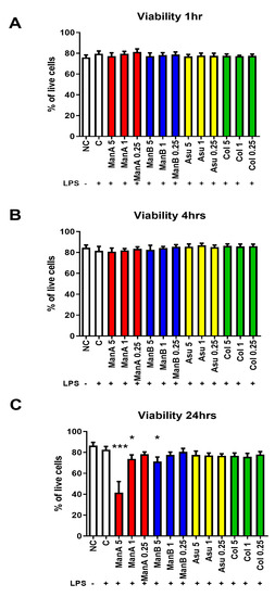 The impact of different manumycin-type metabolites on the viability of THP-1 cells. To assess the possible toxicity of manumycin-type metabolites, the viability of THP-1 cells was tested by Trypan blue using light microscopy at different time points. (A) viability of THP-1 cells after 1 h stimulation; (B) viability of THP-1 cells after 4 h stimulation; (C) viability of THP-1 cells after 24 h stimulation. Statistical significance values indicated as follows: * p ≤ 0.05, *** p ≤ 0.001. Sample legend: NC—non-stimulated control, LPS—lipopolysaccharide, ManA—manumycin A, ManB – manumycin B, Col—colabomycin E, Asu—asukamycin.
