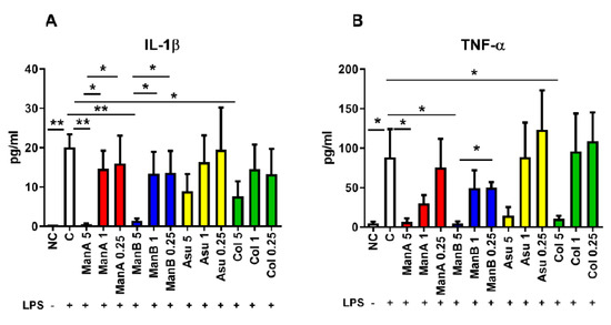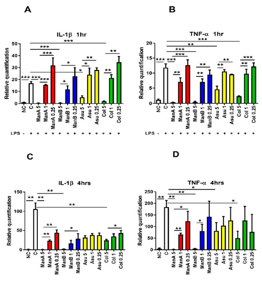 Similarly, the 5 μM concentration of ManB downregulated LPS-induced expression of Il1b (p = 0.0002), but the gene expression was not suppressed at lower concentrations of ManB being significantly increased in comparison to 5 μM ManB (p = 0.0107 for 1 μM Man B and p = 0.0183 for 0.25 μM ManB). Asu limited LPS-induced gene expression of Il1bat concentration of 5 μM (p = 0.017), while 1 μM and 0.25 μM concentrations of Asu did not have any effect (p = 0.0151 and p = 0.0098, respectively). Lastly, the same effect was found in Col: Il1bexpression was significantly suppressed only by the highest concentration of 5 μM (p = 0.0003). The other concentrations of Col used had no impact on suppression of Il1bexpression in THP-1 cells (p = 0.011 and p = 0.012, respectively), Figure 3A.