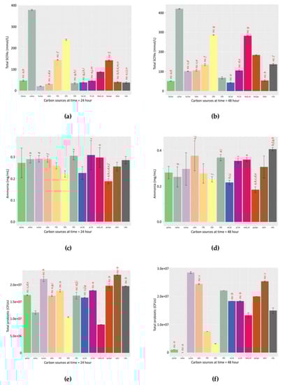 Total short-chain fatty acids (mM), dissolved ammonia (mg/mL), and total probiotic population (CFUs) produced by fermentation against the 13 carbohydrates and the SCFAs/NH3 ratio at 24 and 48 h. (a) Total short-chain fatty acids (SCFAs) at time = 24 h; (b) total short-chain fatty acids at time = 48 h; (c) total ammonia concentration (NH3) at time = 24 h; (d) total ammonia concentration at time = 48 h; (e) total probiotic population at time = 24 h; (f) total probiotic population at time = 48 h, and commensal bifidobacteria are enumerated as total probiotics; (g) SCFAs/NH3 ratio at time = 24 h; (h) SCFAs/NH3 ratio at time = 48 h. ANOVA with Tukey HSD posthoc adjustment (CI = 0.95) was used, paired-letters represented p-value < 0.05; “ns” denoted pairs with differences that are “non-significant” while all other pairs are statically significant to avoid over-crowded superscripts.