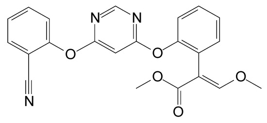 Azoxystrobin (Figure 1), the first strobilurin compound, was released in 1996 [13]. Despite the fact that azoxystrobin was designed against fungal pathogens with higher curative and control activity, evidence suggest that it may pose a serious threat to the ecosystems [6,14,15]. Berenzen et al. [16] detected azoxystrobin in 12 out of 18 German streams at concentrations of 0.05 to 29.7 μg·L−1. According to the European Food Safety Authority, azoxystrobin is one of the most frequently found pesticides in cereal crops and is classified as highly toxic to aquatic organisms or agricultural beneficial organisms [5,17,18,19]. Due to its toxicity towards non-target species, an effective remediation approach for removal of this pesticide is urgently required.