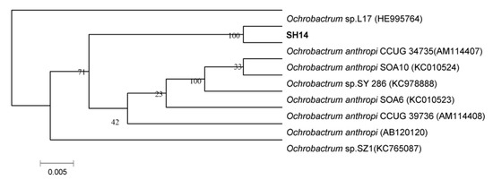 Based on the phylogenetic analysis of 16S rDNA gene sequences, strain SH14 was tentatively identified as Ochrobactrum anthropi and closely clustered with O. anthropi CCUG 34,735 (GenBank accession number AM114407) showing over 99% similarity (Figure 2). API 20 NE identification systems classified strain SH14 as O. anthropi with 99.9% identification. This isolated strain was deposited in the China Center for Type Culture Collection (collection number: CCTCC M 2013681).