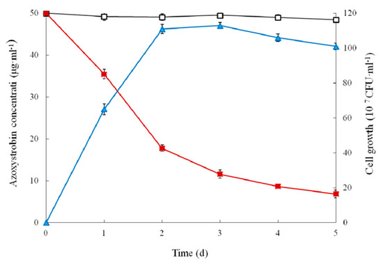 Azoxystrobin concentration was monitored by HPLC equipped with a C18 reversed-phase column (Phenomenex, 250 nm × 4.60 mm, 5 μm, Alliance e2695, Waters Corporation, Milford, MA, USA) and a PAD detector at a column temperature of 28 ± 1 °C. Then, 10 μL of each sample was injected and azoxystrobin concentration was determined at 230 nm wavelengths. A mobile phase of 70:30 acetonitrile/water (v/v) was used at a flow rate of 1.0 mL·min−1 [48].