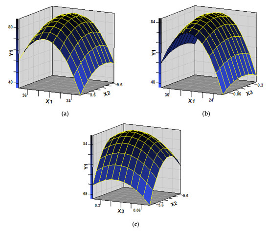 Single-factor experiments were conducted to determine the effects of important variables such as temperature (X1), pH (X2), and inocula(X3). As shown in Table S1, linear and square terms of temperature (X1), media pH (X2), and inocula(X3) were significant (p < 0.05). Three-dimensional response surface plot (Figure 4) intuitively displayed the interactive effect of strain SH14 on azoxystrobin degradation. As shown in Figure 4, the stationary point predicts a maximum value of azoxystrobin degradation. According to the stationary point and quadratic regression equation (Equation(5)), optimum conditions for the three variables (X1, X2, and X3) were determined as temperature 30.2 °C, pH 7.9, and 1.1 × 107 CFU·mL−1 of inoculum, respectively.