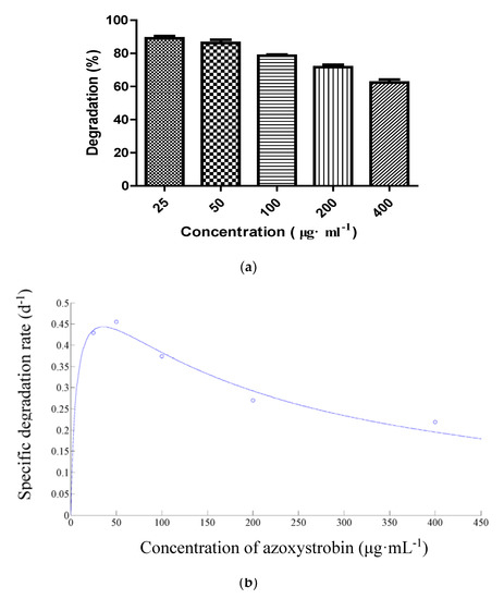 (a) Degradation of azoxystrobin at different concentrations; (b) Relationship between initial azoxystrobin concentration and specific degradation rate (q) of strain SH14. The dot in (b) refers to the specific degradation rate (d−1) at the concentration of 25, 50, 100, 200, and 400 μg·mL−1 of azoxystrobin, respectively.