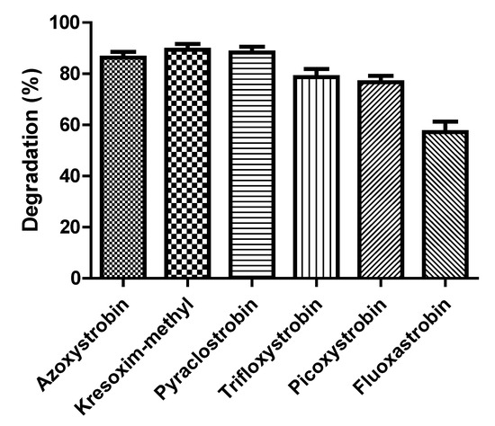 The degradation rate of various strobilurins by strain SH14 was detected and explained in Figure 7. Results demonstrated that strain SH14 utilized and degraded all the tested compounds as growth substrates. After 5 days of incubation, degradation of azoxystrobin, kresoxim-methyl, pyraclostrobin, trifloxystrobin, picoxystrobin, and fluoxastrobinwas noted as 86.3%, 89.4%, 88.5%, 78.7%, 76.6%, and 57.2%, respectively. Strain SH14 degraded a wide range of strobilurin fungicides that advocates its promising and competitive role in bioremediation. Similarly, Howell et al. [31] have also reported microbial degradation of azoxystrobin. Microbes degraded different strobilurin fungicides including trifloxystrobin, pyraclostrobin and kresoxim-methyl. However, trifloxystrobin-degraders isolated by Clinton et al. [30] could not degrade azoxystrobin. This distinction can be attributed to the substrate specificity or no-substrate specificity of catabolic enzymes associated with strains. Previous reports about herbicides also had the same observation [27,52,65,66] and another reason could be the similar structure of tested compounds as reported in pyrethroids [67,68,69,70].