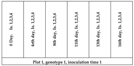 The plant material was evaluated in the nursery of the Cereal Research Nonprofit Ltd. in Szeged, Hungary, (46°14′24″ N, 20°5′39″ E) over two seasons (2012/2013 and 2013/2014). The field experiments were conducted in three replications in a randomized complete block design. A plot (genotype, replicate) consisted of 12 rows, 1.5 m long with a 20 cm row spacing. For the six inoculation times, two row subplots were used. For control, the first inoculation served as the mid-anthesis inoculation (Figure 1). The seven cultivars and three replicates produced 21 plots for an experiment. Each genotype per replications was sown in six (one plot per inoculation date) two-row plots of 1.5 m length in mid-October, using a Wintersteiger Plot Spider planter (Wintersteiger GmbH, Ried, Austria). The width of the plots was approximately 40 cm.