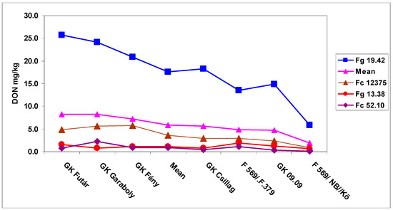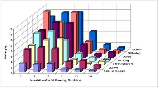 Therefore, counting by FDK and FDK, the susceptibility window lasted for the same eight days for all resistance classes. Also, different cultivar reactions can be recognized. The most resistant F569/Kő had the lowest DON at about 3 mg/kg, and this could decrease the DON level below the EU limit of 1.25 mg/kg. The case of the GK Fény variety is important, since in 2010 the large FHB epidemic damaged it only moderately in contrast to GK Garaboly, which had the highest DON contamination at flowering. We observed a similar phenomenon with GK Csillag; its resistance was better than GK Fény. Attention should be paid to the fact that in normal testing only the first inoculation was made and the others were not existing. The data show also that to see the resistance behavior for delicate and highly important cultivars, the 11th- and 16th-day inoculation is suggested. By this way we could detect cultivars like GK Csillag, that was rather susceptible at mid-anthesis and could be discarded based on disease index, but in later inoculation dates it gave the second place following the most resistant genotype. Correlations between genotype reactions were very close, as it was for FDK, but at a higher level (Table 5B). Therefore, cultivars across inoculation times behaved similarly. We should also consider that good correlations existed for the DON data only between the first four inoculation dates, during the later inoculation periods no significant correlations were found (Table 5C). This means that the resistance relationships do not automatically follow this range later on, so therefore unexpected phenomena may occur. Only one example, GK Csillag, had 10 ppm DON content at mid-flowering and 0.64 ppm on the last inoculation. F569/Kő started with 2.98 and finished with 0.57 mg/kg, practically the same value. The DON data in graphical form (Figure 2) shows the genotype reaction during the six inoculation periods. The DON regulation seemed to be more complicated than usually expected.