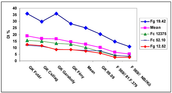 The general means of the isolate data showed rather large differences for DI, but for all isolates the genotype differences were significant (Figure 3). Fg 19.42 isolate was the most aggressive; the others displayed only 40–50% of its value. The FDK data showed larger isolate differences than DI, the resistance differentiation less expressed for the three less aggressive isolate (Figure 4). We had the largest difference between isolates for DON compared to DI and FDK (Figure 5); the Fg 19.42 isolate kept its excellent performance, the Fc 12375 showed yet significant differences, and the two least aggressive isolates did not show a proper differentiation, as they showed for DI and FDK. It seems that even at medium aggressiveness in DI or FDK can cause a problem in DON response.