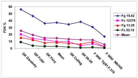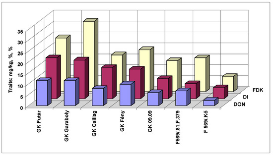 The general means for the genotypes and traits showed several tendencies (Figure 7). The most resistant F569/Kő showed the lowest values for all three traits. The F569/81.F.379 had an FDK value twice as large compared to the FHB than the most resistant genotype. As we have the mean values of six inoculations, the resistance data are more reliable than only with one inoculation at full flowering stage. Thus, this two-fold difference does not seem to have occurred due to random chance. It is remarkable that GK Csillag was for visual symptoms among the more susceptible cultivars, but one of the best in counting for DON.