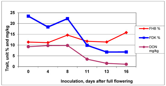 Looking at the three traits across cultivars, we observed a clear picture of how the FHB data did not show any sign of decreasing during the 16-day period. However, the FDK and DON showed much similarity (Figure 6). The correlation for disease index/FDK was r = −0.1639, DI/DON was r = −0.2347, and FDK/DON was highly significant at r = 0.9673 with p = 0.01. This is again an argument that FDK is a more important trait to characterize resistance level than DI.