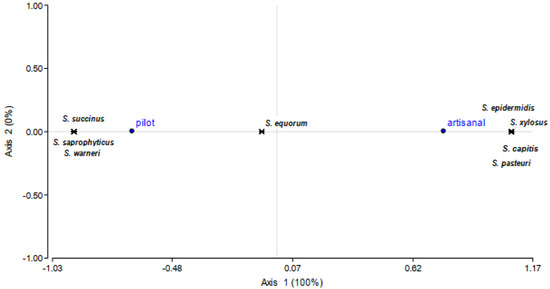 Correspondence analysis biplot of Staphylococcus (S) species and type of production (pilot or artisanal). Contribution to Chi-square is indicated in brackets.