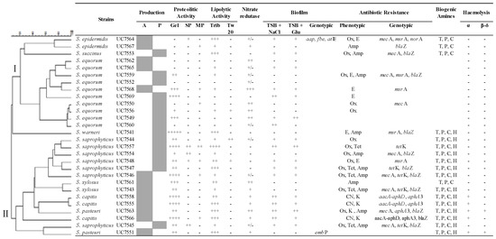 The technological properties were evaluated on the 28 staphylococci biotypes. Proteolytic and lipolytic are important activities for the sensory quality of fermented meat through release of various aromatic compounds and organic acids [20]. The proteolytic activity tested on three different protein sources was more evident on gelatin (71.4% of strains), especially by S. capitis strains. Only the 18% and 25% of strains showed weak proteolysis against sarcoplasmic or myofibrillar proteins, respectively. Contrary to our results, Cachaldora et al. [22] found higher proteolysis against myofibrillar and sarcoplasmic proteins and Landeta et al. [12] reported that only one CNS resulted positive to gelatinase activity assay. The lipolytic activity on tributyrin medium highlights a good activity (>1 mm of clear halo) in the 42.8% of the CNS strains analyzed, being S. equorum the less lipolytic strains (Figure 2). In contrast with our results, Jeong et al. [15] reported high tributyrin activity in S. equorum isolated from jeotgal, a Korean high-salt-fermented seafood, while Martin et al. [5] described S. xylosus and S. epidermidis, as the species showing high activity. Weak lipolytic activity on Tween 20, as lipid source, was observed only in two S. saprophyticus and one S. equorum strains (Figure 2). Similar results were found in a previous study [12] where none of the analyzed CNS strain were able to hydrolyze Tween 20.