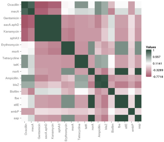 Correlation matrix of phenotypic and genotypic features regarding antibiotic resistance and bioflm formation ability.