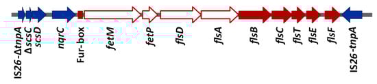 In previous studies, our group characterized an antibiotic resistance-encoding plasmid named pUO-StVR2, which is derived from pSLT, the virulence plasmid of S. enterica serovar Typhimurium (S. Typhimurium). This plasmid is widespread in clinical isolates from Spain and Portugal and was also detected in strains from the United Kingdom and Italy [18,19,20,21,22]. pUO-StVR2 contains a group of ORFs, here designated the fetMP-fls cluster (Figure 1), which are transcribed in the same orientation and preceded by a potential binding site for the ferric uptake regulator (Fur), which acts as a transcriptional repressor of genes and operons involved in iron uptake, using Fe2+ as a corepressor [2,23].
