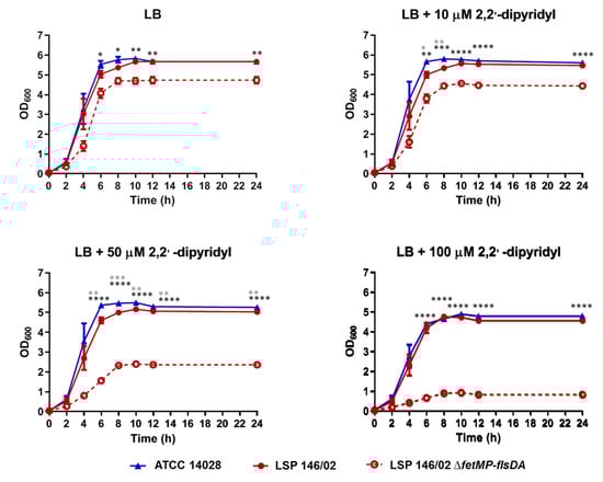 Growth curves obtained for S. Typhimurium ATCC 14028, wild-type S. Typhimurium LSP 146/02, and its isogenic ΔfetMP-flsDA derivative using an LB broth supplemented with increasing concentrations of chelating agent 2,2′-dipyridyl. The data shown are the mean values ± standard deviations of three biological replicates. Statistical significance (**** p < 0.0001; *** p < 0.001; ** p < 0.01; * p < 0.05) was determined by ANOVA and the Tukey’s post-test. Black and grey asterisks show significant differences for LSP 146/02 versus ΔfetMP-flsDA and ATCC 14028, respectively.