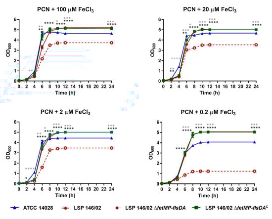 Growth curves obtained for S. Typhimurium ATCC 14028, S. Typhimurium LSP 146/02 wild-type, its isogenic ΔfetMP-flsDA derivative, and the complemented LSP 146/02 ΔfetMP-flsDAC strain using a PCN medium supplemented with decreasing concentrations of FeCl3. The data shown are the mean values ± standard deviations of three biological replicates. Statistical significance (**** p < 0.0001; *** p < 0.001; ** p < 0.01; * p < 0.05) was determined by ANOVA and the Tukey’s post-test. Black and grey asterisks show significant differences for LSP 146/02 versus ΔfetMP-flsDA and ATCC 14028, respectively. Significant differences were not observed for LSP 146/02 versus LSP 146/02 ΔfetMP-flsDAC.