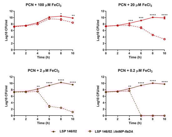 Competition assays of the S. Typhimurium LSP 146/02 wild-type strain and its isogenic derivative ΔfetMP-flsDA using a PCN medium with different concentrations of FeCl3. The data shown are the mean values ± standard deviations of three biological replicates. Statistical significance (**** p < 0.0001; *** p < 0.001; ** p < 0.01; * p < 0.05) was determined using a one-sample t-test at each time point tested.