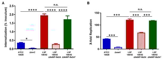 Invasion of epithelial HeLa cells (A) and replication within RAW264.7 macrophages (B) by wild-type S. Typhimurium LSP 146/02, its ΔfetMP-flsDA isogenic derivative, and the latter strain complemented with the cloned fetMP-flsDA genes (LSP 146/02 ΔfetMP-flsDAC). The data shown are the mean values ± standard deviations of three biological replicates. Statistical significance (**** p < 0.0001; *** p < 0.001; ** p < 0.01; * p < 0.05; n.s., not significant) was determined by one-way ANOVA and the Tukey´s post-test.