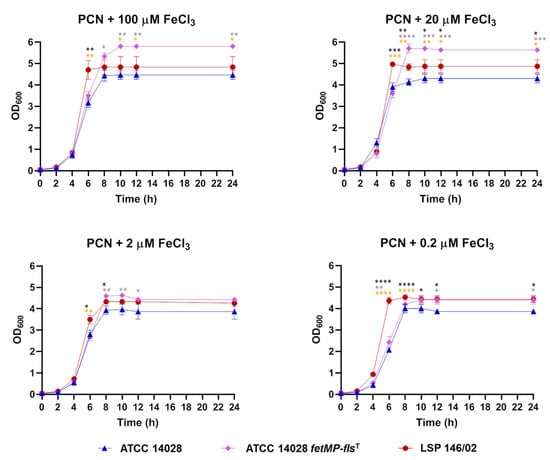 Growth curves obtained for S. Typhimurium ATCC 14028 with and without the cloned fetMP-flsDA genes (ATCC 14028 fetMP-flsDAT) using a PCN medium supplemented with decreasing concentrations of FeCl3. The data shown are the mean values ± standard deviations of three biological replicates. Statistical significance (**** p < 0.0001; *** p < 0.001; ** p < 0.01; * p < 0.05) was determined by ANOVA and the Tukey’s post-test. Black, grey, and orange asterisks show significant differences for ATCC 14028 versus LSP 146/02, ATCC 14028 versus ATCC 14028T, and LSP 146/02 versus ATCC 14028 fetMP-flsDAT, respectively.