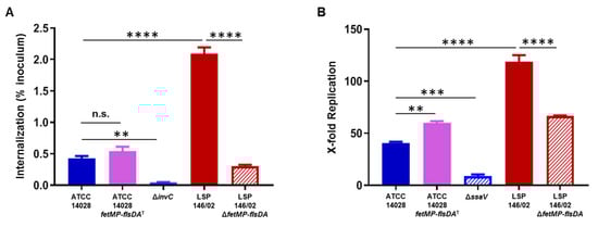 Invasion of epithelial HeLa cells by S. Typhimurium ATCC 14028 harboring the cloned fetMP-flsDA genes (ATCC 14028 fetMP-flsDAT) (A) and replication of the same strain within RAW264.7 macrophages (B). The data are the mean values ± standard deviations of three biological replicates. Statistical significance (**** p < 0.0001; *** p < 0.001; ** p < 0.01) was determined by one-way ANOVA and the Tukey´s post-test.