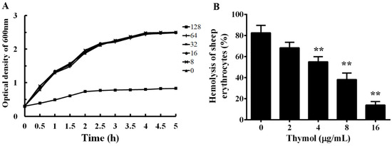 Influence of thymol on the growth and hemolytic activity of A. hydrophila. A, growth curves of A. hydrophila co-cultured with different concentrations of thymol in BHI medium. B, Hemolytic activity of A. hydrophila supernatants co-cultured with indicated concentrations of thymol; sheep erythrocytes treated with Triton X-100 served as the positive control. All the data in Figure 2B are shown as mean value ± SD of three independent assays, **, p < 0.01 compared with thymol-free culture.