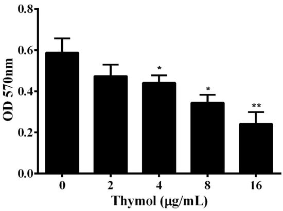 Contamination from bacterial persistence and antibiotic resistance is due to the formation of biofilm, which protects the bacteria from being washed away [19]. According to previous studies, about 90% of bacteria can form biofilms [20]. Biofilm has been demonstrated to be involved in the antibiotic resistance and virulence of pathogenic A. hydrophila [21,22]. Thus, the impact of thymol on the formation of biofilm was determined in a 96-well plate. The results show that thymol could significantly reduce the biofilm formation of A. hydrophila in a dose-dependent manner (Figure 4). When treated with thymol at concentrations higher than 2 μg/mL, the biofilm was significantly decreased (Figure 4).
