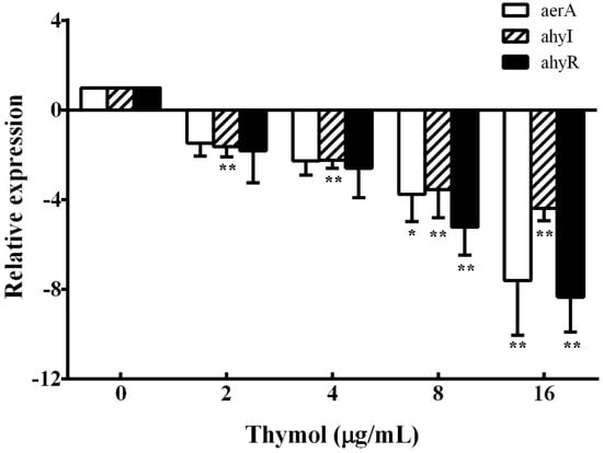 According to the results of hemolysis assay and biofilm formation assay, we found that thymol could inhibit the production of aerolysin and biofilm. These results indicate that thymol might reduce the hemolytic activity and biofilm formation of A. hydrophila by inhibiting the quorum sensing (QS) system. Thus, the transcription of aerolysin encoding gene aerA, QS signaling pathway regulator ahyI, and ahyR were studied. As shown in Figure 5, compared with the thymol-free group, the aerA gene was down-regulated 7.61-fold when treated with 16 μg/mL thymol. Similarly, ahyI and ahyR were also down-regulated 4.39- and 8.34-fold, respectively, when treated with 16 μg/mL thymol.