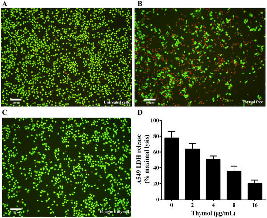 Thymol protects A549 cells against aerolysin-mediated cell injury. For live/dead assay, cells were stained with a LIVE/DEAD Viability/Cytotoxicity Kit and images were captured by a fluorescence microscope. A fluorescent-red dye stained dead cells, while a fluorescent-green dye stained live cells. For lactate dehydrogenase (LDH) assays, LDH release was detected by a Cytotoxicity Detection Kit. (A) untreated cells; (B) cells treated with bacterial supernatant without thymol; (C) cells treated with supernatant of A. hydrophila co-cultured with 16 μg/mL thymol; (D) LDH release of A549 cells when treated with supernatants co-cultured with indicated concentrations of thymol. All data are presented as mean value ± SD of three independent assays.