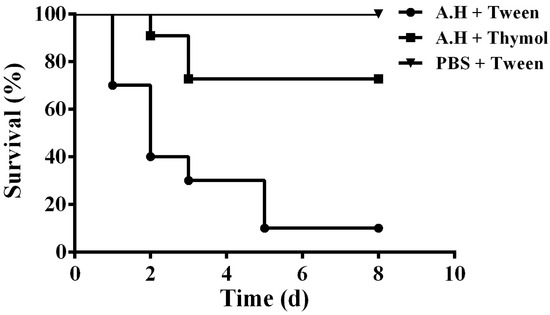 The in vitro results demonstrated that thymol could significantly decrease the production of aerolysin, biofilm, and injury of A549 cells mediated by aerolysin in sub-inhibitory concentrations. Taken together, these results indicate that thymol has potential therapeutic effects against A. hydrophila infections. Thus, the infection models were established by infecting channel catfish with A. hydrophila. The channel catfish infected with A. hydrophila showed swelling around the fin and weight loss. Deaths were observed from 24 h post infection. As shown in Figure 7, the survival rate of infected fish following administration with thymol was 70%, while it was 10% for fish infected with A. hydrophila and administered with Tween 80. No deaths were observed in the group injected with sterile PBS (Figure 7). Taken together, thymol could significantly decrease the mortality of the channel catfish infected with A. hydrophila.