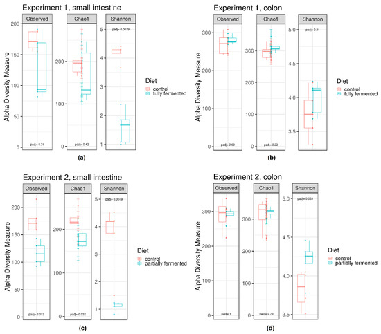Alpha diversity in intestinal contents depending on the experiment, sampling point and dietary treatment. Box plots showing alpha diversity in samples using the species richness estimators of the Observed Species, Chao1 and Shannon indices. Comparisons of the species richness estimators were done by the Wilcoxon rank sum test with p-value adjustment method: holm. (a) Experiment 1, small intestine; (b) Experiment 1, colon; (c) Experiment 2, small intestine; (d) Experiment 2, colon.