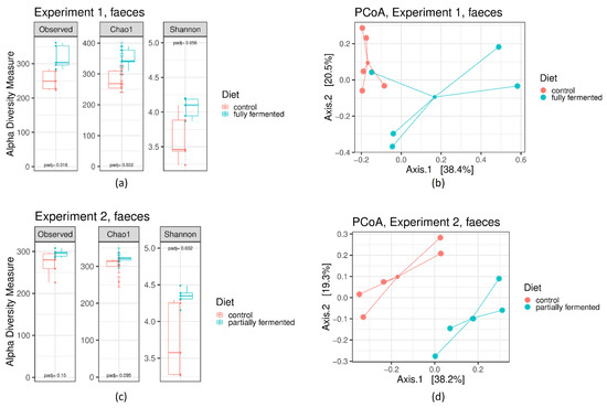 Alpha diversity in the faecal samples (day 21 of the experiment) depending on experiment and dietary treatment. Box plots showing alpha diversity in samples using the species richness estimators of the Observed Species, Chao1 and Shannon indices. Comparisons of the species richness estimators were done by the Wilcoxon rank sum test with p-value adjustment method: holm. A Bray-Curtis dissimilarity-based principal coordinate analysis (PCoA) was performed on the faecal samples. Each point represents a different animal; colored lines connect animals of one dietary treatment (control, fully fermented or partially fermented): (a) Alpha diversity in Experiment 1; (b) PCoA in Experiment 1; (c) Alpha diversity in Experiment 2; in (d) PCoA in Experiment 2.