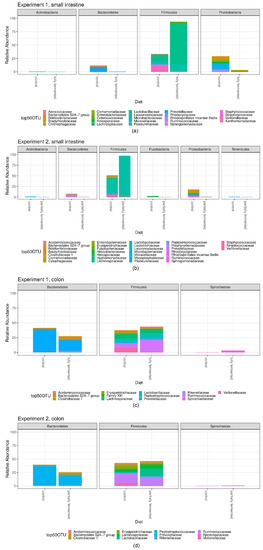 Relative abundance of the 50 most abundant operational taxonomic units (OTUs) belonging to the bacterial families within the different phyla in (a) Experiment 1, small intestine; (b) Experiment 2, small intestine; (c) Experiment 1, colon, and (d) Experiment 2, colon.