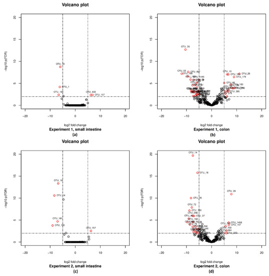 Volcano plot visualizing –log10 false discovery rate (FDR)-adjusted p-values versus log2 fold changes for all 531 OTUs. The horizontal lines show the significance threshold for an FDR < 0.01. Each open point represents a single OTU in (a) Experiment 1, small intestine; (b) Experiment 1, colon; (c) Experiment 2, small intestine, and (d) Experiment 2, colon. Open points above the significance threshold and beyond the log2 fold change criterion of ±5 are colored red.