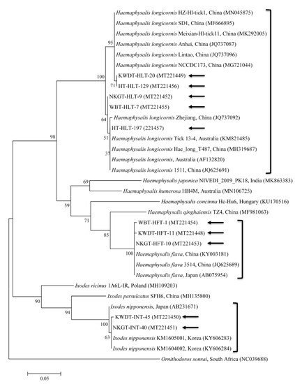 COI sequences from collected H. longicornis shared 98.2–99.6% nucleotide identity with a known COI sequences of H. longicornis (Figure 1). The COI sequences from collected H. flava and I. nipponensis shared 97.2–98.7% and 97.9–98.5% nucleotide identity with known COI sequences, respectively (Figure 1). H. longicornis is naturally collected from grasses and herbaceous vegetation, H. flava is naturally collected from forests, and I. nipponensis is collected from both habitats in South Korea [25]. All three ticks identified in this study are vectors and hosts for many TBPs and can transmit them to humans and animals in South Korea [13,14,27,28].
