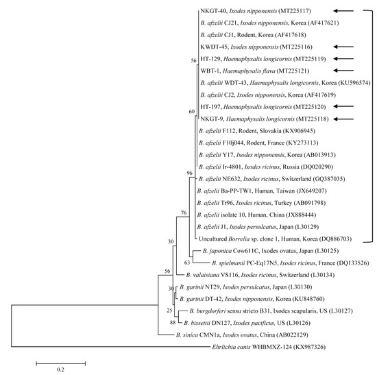 Phylogenetic tree constructed using the maximum likelihood method and based on the 5S–23S rRNA nucleotide sequences of Borrelia spp. Ehrlichia canis was used as the outgroup. Black arrows indicate the sequences analyzed in this study. B. afzelii, B. bissettii, B. burgdorferi s.s., B. garinii, B. spielmanii, and B. valaisiana infect humans with pathogenic potential, causing Lyme borreliosis. B. japonica and B. sinica have not yet been reported in or isolated from humans. GenBank accession numbers for other sequences are shown with the sequence name. Branch numbers indicate bootstrap support (1000 replicates). The scale bar indicates the number of substitutions per nucleotide.