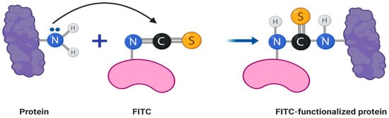 FITC conjugation occurs through the free amino groups of proteins or peptides of the phage scaffold, forming a stable thiourea bond.