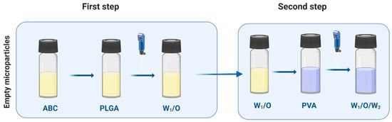 Double-emulsion solvent evaporation method (W1/O/W2). Fabrication of empty microparticles (MPs).