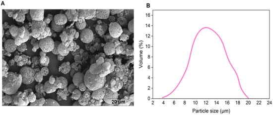 (A) SEM of empty MPs. (B) Size distribution of porous empty MPs.