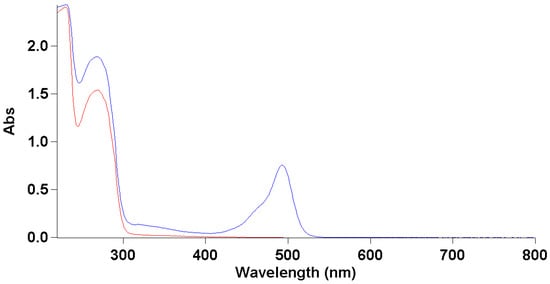 UV spectrum of protein fd bacteriophage before and after conjugation with FITC. The red line is the UV spectrum of bacteriophage before conjugating with FITC. The blue line is the UV spectrum of bacteriophage after conjugation with FITC.