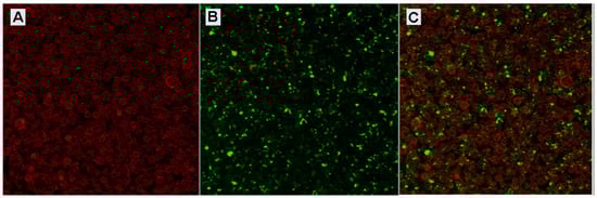 In detail, bacteriophage-loaded PLGA MPs were synthesized to see the PLGA structure using an excitation source at 550 nm and an emission range of 600–700 nm. Moving the λexc to 488 nm and the emission band between 500–600 nm, we were able to evaluate the correct bacteriophage deposition within an external shell of the MPs against the post-encapsulation method and this was also confirmed by the overlay of the two channels (Figure 6).