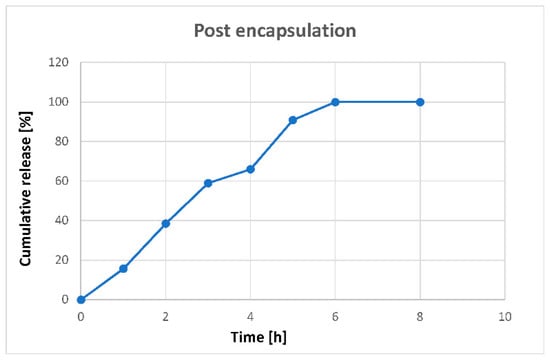 The release of bacteriophages was evaluated for post-encapsulated bacteriophage-MPs over time. After resuspension of the MPs, bacteriophage started suddenly to be slowly released. After 6–8 h, practically all bacteriophages had been released (Figure 7).