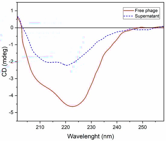 Circular dichroism (CD) analysis of free bacteriophage was compared to the bacteriophage encapsulated within MPs, then released in phosphate buffer pH 7.4. In particular, as reported in Figure 8, the free bacteriophage showed a mixed α-helix–β-sheet conformation at a concentration of 0.35 mg/mL (blue spectrum), with a pronounced minimum at 222 nm (typical of the β structures) and two shoulders: one negative at 205 nm, and one positive at 190 nm, which are characteristic signs of ellipticity. The same considerations can be made for the bacteriophage released from the post-encapsulated MPs (6 h, 0.14 mg/mL (red spectrum)), which showed the mixed α-helix–β-sheet conformation to be a free underlying bacteriophage, since this incubation methodology does not affect protein stability.