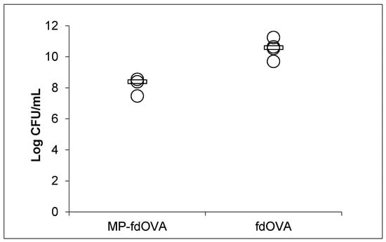 Effect of the encapsulation process on the biological activity of the bacteriophage. Infectivity of free filamentous bacteriophage fdOVA or fdOVA released from MPs (MP-fdOVA). The infectivity was expressed as the number of colony-forming units of TG1 E. coli bacterial cells infected with bacteriophage that were able to grow on Ampicillin plates. Each measurement was performed in triplicate, and the median of three different experiments is reported (black line). Differences are not significant (p > 0.05 by Student’s t-test).
