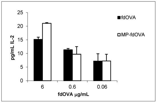 We evaluated the immunological response to the antigen delivered by bacteriophage particles after the encapsulation process. Antigen presentation functions are crucial for the activation of an immune response. Mouse BM-DCs were incubated overnight with free fdOVA bacteriophage or fdOVA bacteriophage prior to release from MPs. DCs were then assessed for their capability to process filamentous bacteriophage and activate OVA (257–264)-specific hybridoma T cell B3Z, a CD8+ T cell line known to produce IL-2 exclusively upon activation of a T cell receptor specific to the OVA (257–264) SIINFEKL peptide in the context of H-2Kb MHC class I complex, expressed on APCs. B3Z activation in response to OVA (257–264) was measured by interleukin-2 (IL-2) released in the culture supernatants. We found that fdOVA bacteriophage released from MPs after post encapsulation was able to be taken and processed by dendritic cells, inducing a B3Z response similar to the one obtained using free fdOVA bacteriophage (Figure 10). Empty MPs used at the highest concentration did not induce IL-2 release (data not shown).